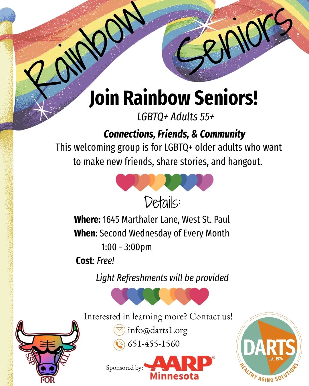 Rainbow Seniors is focused on the LGBTQIA2S+ community in Dakota County. DARTS, South St. Paul for All and others are working to build community for older members of the community who are isolated and alone. Every second Wednesday of the month from 1 p.m. to 3 p.m. we gather at DARTS in West St. Paul. If you would like additional information please call Harry at 651-399-7801.