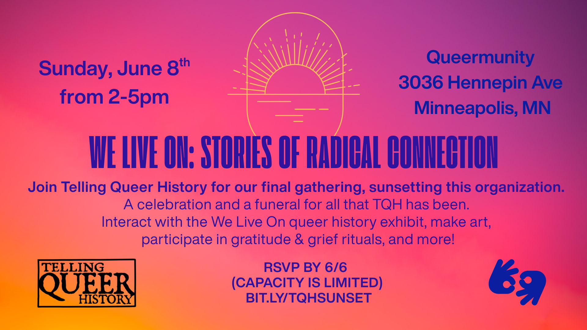 What: Interact with our exhibit, We Live On: Stories of Radical Connection, at its final location in Minneapolis. Celebrate the stories shared, community connections made, and the people that helped make Telling Queer History possible for 12 years. We will premiere the documentary film about TQH, there will be two storytellers, a ritual of gratitude & release led by the Ladies of the Lake, post-event snacks, and other activities.