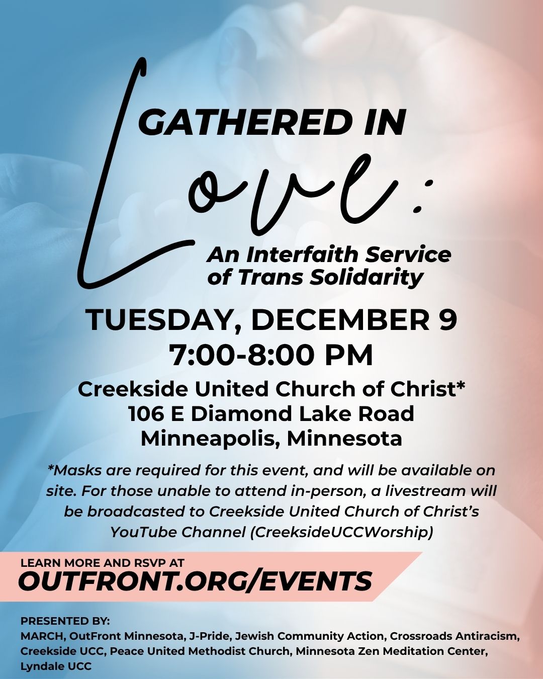 Creekside UCC 106 E Diamond Lake Rd, Minneapolis, United StatesEvent Description: Join us for the Trans Solidarity Service, a multifaith gathering affirming the sacredness of trans and nonbinary lives. On Tuesday, December 9, 2025, people from across Minnesota are […]