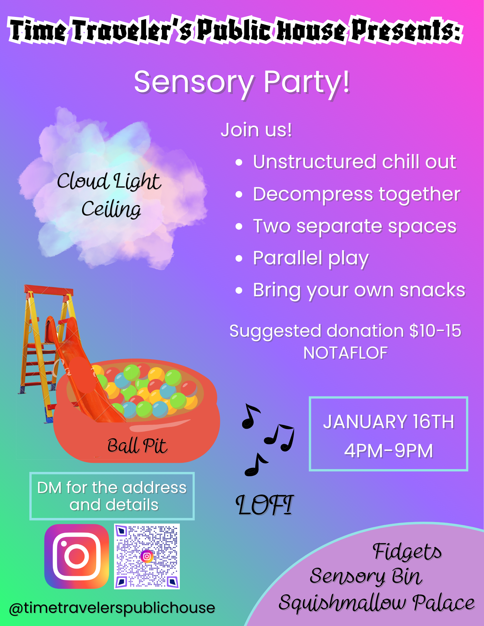 Time Travelers Public House Brooklyn center, MN, United StatesBall Pit & Sensory Hangout! Date: January 16th Time: 4 PM – 9 PM $10-15 NOTAFLOF Our temporary spare bedroom has been transformed into a ball pit & sensory room, […]