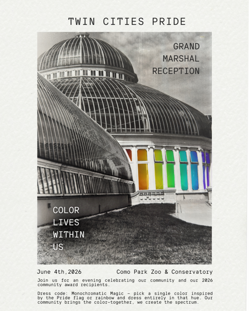 Join us for an unforgettable evening at the Como Park Zoo & Conservatory as we gather to celebrate our 2026 Grand Marshal, Our Community—for those we stand shoulder to shoulder with, those we carry, and those whose memory we carry forward.