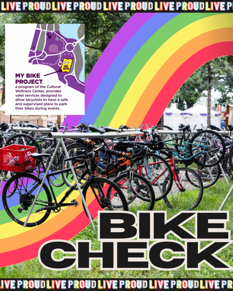 Navigating to Pride can be a challenge between traffic and construction! But with Bike Check it just got easier. This is a great space to park your bike while you enjoy the festival!